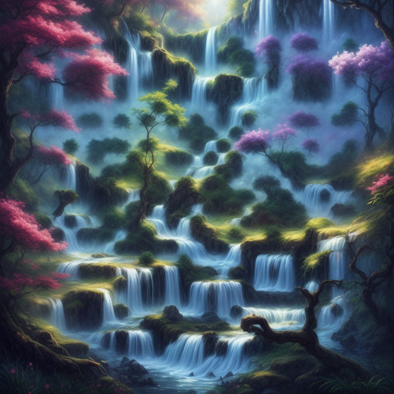 Get lost in the serene beauty of our QR code painting depicting a cascading waterfall in a dense forest. Flowering trees sway gently in the breeze, and vibrant green plants thrive amidst the soothing sounds of gurgling water. This enchanting fantasy-inspired scene provides a serene respite from the hustle and bustle of everyday life.