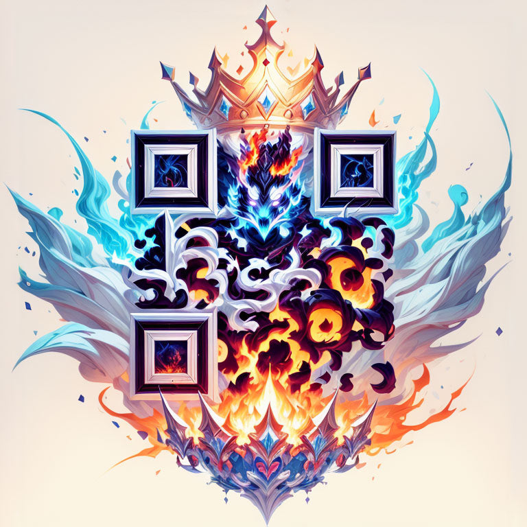 A blazing crown surrounded by wild flames centers this intense crafted QR code. Crowns often symbolize authority and destiny, and this artistic QR code brings an electrifying sense of power and drama. The unique QR code’s rich, fiery palette makes it a bold centerpiece for epic tales.