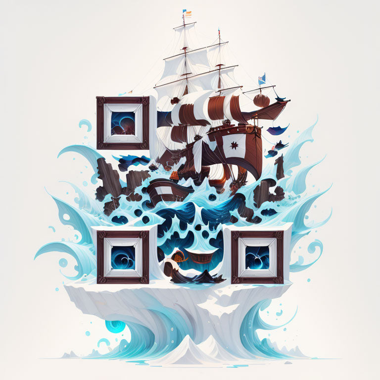 Against the backdrop of a stormy sea, a traveling ship appears with its sails unfurled in this artistic QR code. The swirling waves and the ship towering above them symbolize exploration and perseverance. This unique QR code is perfect for telling stories of daring voyages and adventures on the high seas.