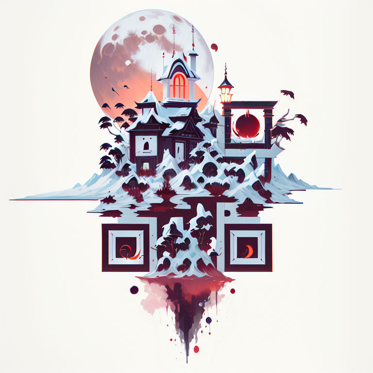 A floating island against a blood red moon adds an eerie dramatic feel to this unique QR code. Associated with change and transformation, the red color enhances the ghostly atmosphere of the artistic QR code. The powerful imagery of this crafted QR code is perfect for dark fantasy and gothic stories.