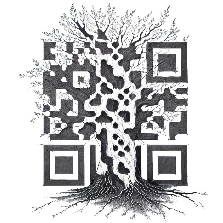 A tree with long roots, a thick and powerful trunk, and a spreading crown represents strength, stability, and the interconnectedness of life. The deep roots symbolize grounding and tradition, while the expansive branches suggest growth and ambition. This unique tattoo QR code incorporates the tree’s natural beauty, with the QR code subtly integrated into the trunk, bridging the gap between nature and technology in a truly unique design.