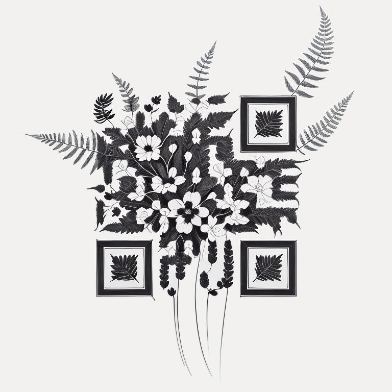 A fern adorned with delicate flowers, forming a graceful floral composition. This unique QR code tattoo represents growth and new beginnings, with the fern symbolizing endurance and the flowers adding a touch of fragility and beauty. The QR code is subtly woven into the foliage, connecting the natural and digital realms in a delicate harmony.