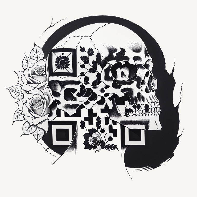 A skull surrounded by roses, with cracks and strokes enhancing the design, forms the central image of this unique tattoo QR code. The roses add an element of beauty and life, while the skull’s wear and tear symbolize the passage of time. The QR code is cleverly integrated into the design, merging macabre themes with modern artistry.