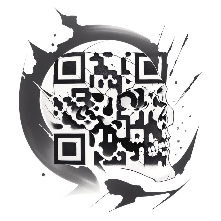 A cracked skull viewed from the side, decorated with patterns resembling paint splatters, creating an edgy and artistic effect. This crafted QR code tattoo represents the fragility of life and the beauty found in imperfection. The paint splatter designs merge with the skull's features, and the QR code is seamlessly hidden within the patterns, adding a futuristic element to the artwork.
