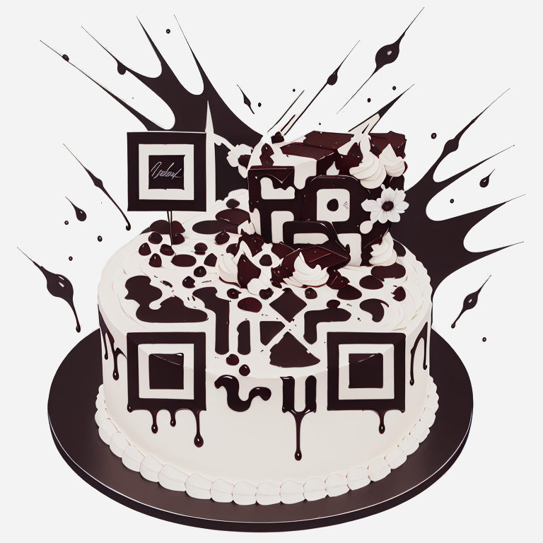 A cake with chocolate, cream, and melted chocolate is a delicious and indulgent design that captures the joy of sweet treats. The layers of rich chocolate and creamy textures make the cake an inviting and mouth-watering focal point. The unique QR code tattoo is integrated into the design, adding a playful and modern twist. This QR code enhances the indulgent theme with a touch of digital innovation.