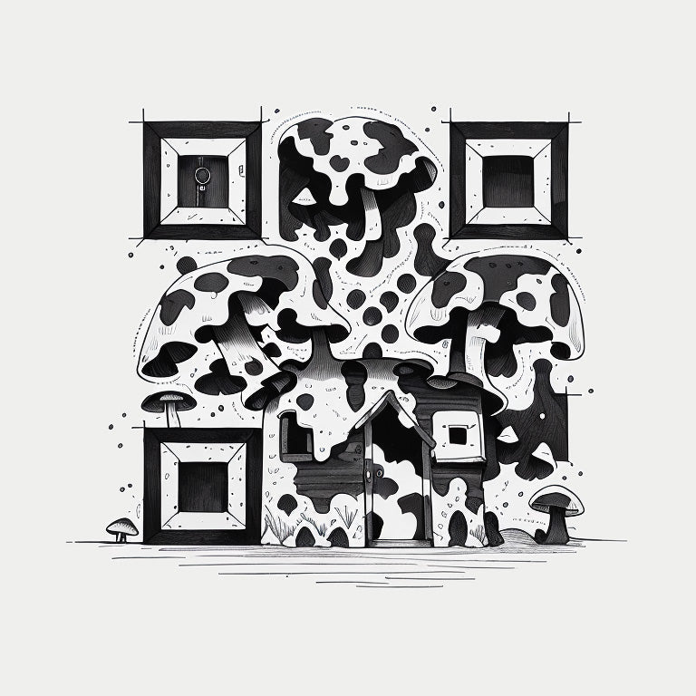 A mushroom house, complete with windows and a door, stands as a tiny, whimsical structure against a white background. This surreal, unreal house evokes a sense of fantasy and imagination, with its tiny proportions and intricate details. The unique QR code tattoo is integrated into the design, offering a digital connection to the magical world of the mushroom house. The QR code adds a modern touch to the fairytale-like imagery, merging fantasy with practicality.