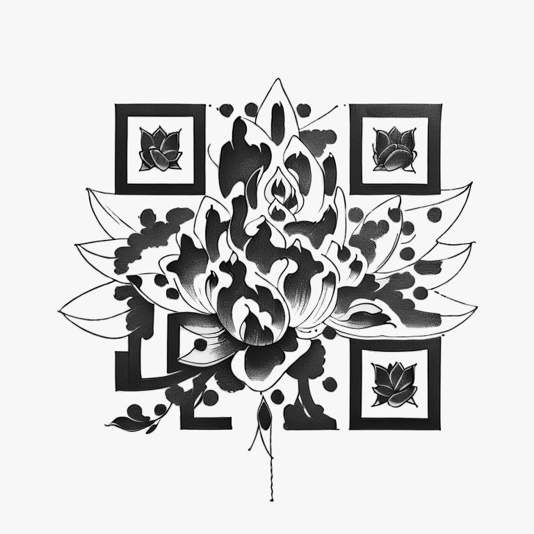 A delicate lotus flower, symbolizing calmness and purity of thought, is captured in soft lines and subtle shading. The lotus is a symbol of spiritual enlightenment and rebirth, rising from the murky waters of life to bloom in purity. At the heart of this unique QR code tattoo, the QR code is carefully integrated into the design, representing the merging of spirituality and technology. This tattoo beautifully blends nature, symbolism, and digital art.