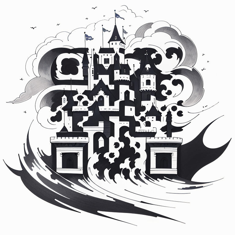A castle surrounded by swirling clouds and billowing waves creates a magical and dramatic atmosphere in this unique tattoo QR code. The powerful imagery of the castle is complemented by the dynamic motion of the clouds and waves, with the QR code subtly integrated into the design. This tattoo is perfect for those who dream of mystical lands and heroic adventures.
