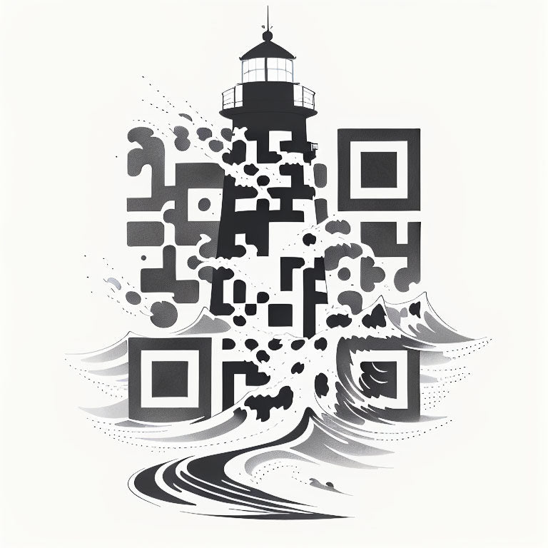 A lighthouse perched on top of a cliff with waves crashing below makes for a dramatic and adventurous tattoo design. The lighthouse stands tall against the turbulent sea, symbolizing hope and guidance amid chaos. The unique QR code tattoo is cleverly placed into the design, offering a modern twist to this classic nautical scene. This art tattoo QR code design combines nature's power with the precision of digital technology.