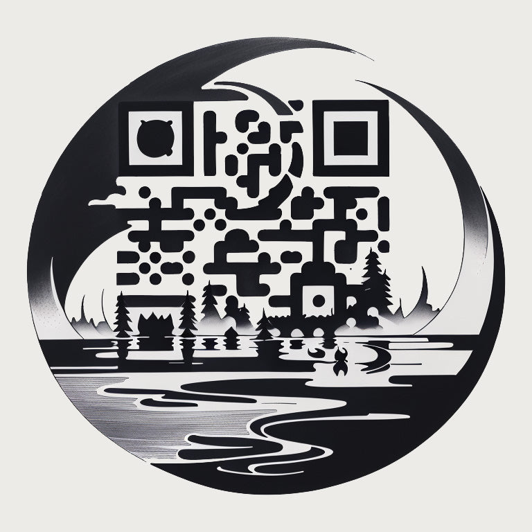 A serene nature painting, reflecting a calm pond with surrounding landscape, forms the backdrop of this unique tattoo QR code. The tranquility of the pond and the beauty of the landscape are captured in soft, natural tones, while the QR code is subtly incorporated, connecting the timeless beauty of nature with modern art.