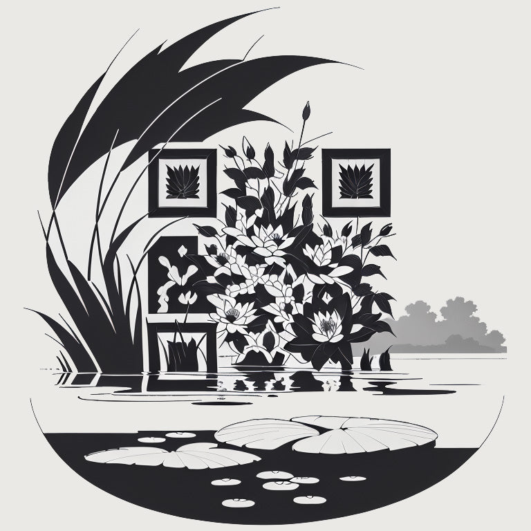 A serene calm pond, with water lilies floating gently on the surface and reeds swaying in the breeze. This unique QR code tattoo captures the peaceful harmony of nature, evoking feelings of tranquility and balance. The water lilies are a symbol of beauty and serenity, while the QR code subtly integrates into the design, offering a modern interpretation of this timeless natural scene.