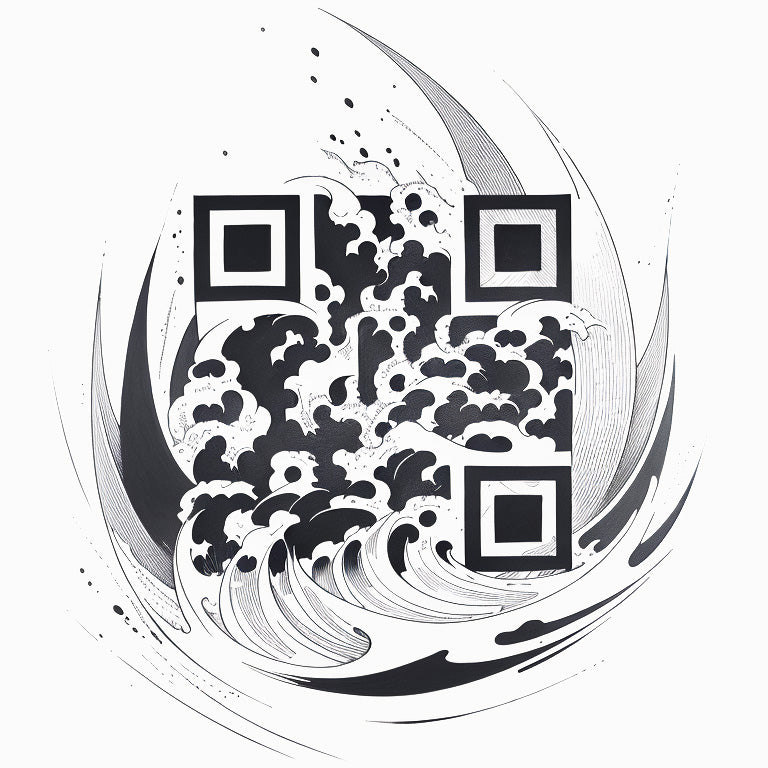 An abstract wave pattern flows with rhythm and motion, symbolizing the ever-changing nature of life and creativity. The sweeping ink strokes and dynamic composition create a sense of movement, giving the design an energetic yet artistic appeal. The inclusion of an artistic QR code tattoo enhances the fluidity of the piece, offering a contemporary twist on classic abstraction. This QR code adds a unique, interactive layer to the artwork.