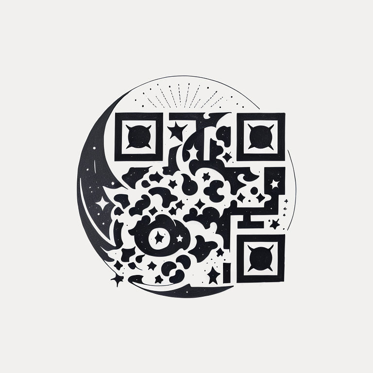 A crescent moon surrounded by stars forms the basis of this unique tattoo QR code, set against an abstract sky. The design captures the magic of the night sky, with the QR code seamlessly embedded in the celestial elements. Ideal for those who appreciate the serenity of the moon and stars, this tattoo is a beautiful representation of cosmic energy and mystery.