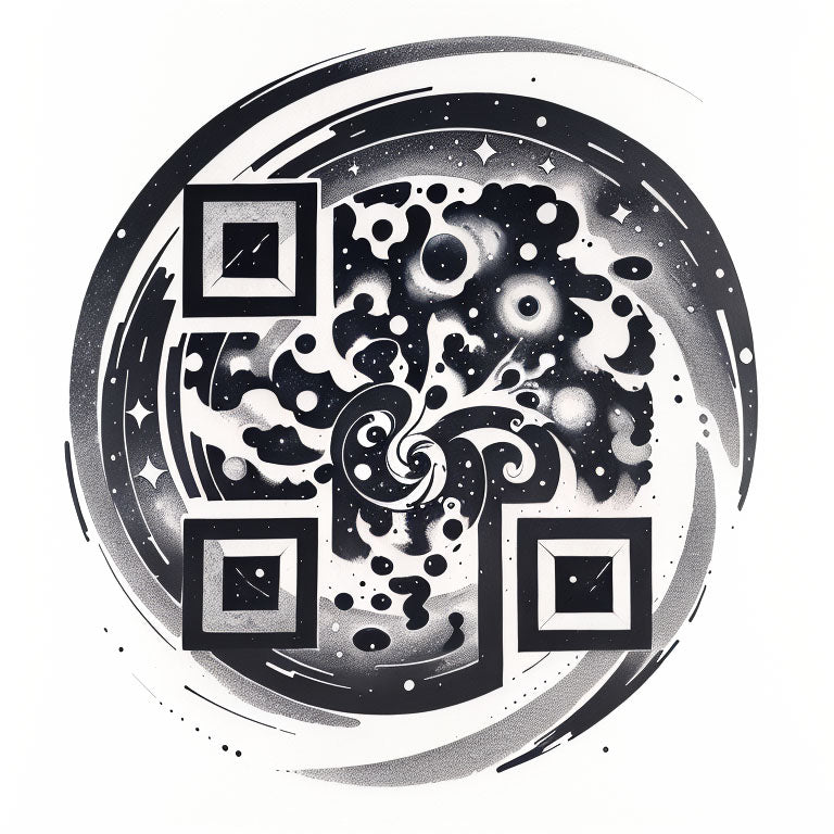 A galaxy tattoo in a spiral shape, rendered against a white background, forms a stunning cosmic scene in this unique tattoo QR code. The swirling pattern of stars and galaxies represents the infinite possibilities of the universe, with the QR code subtly integrated into the design, blending celestial beauty with modern technology.