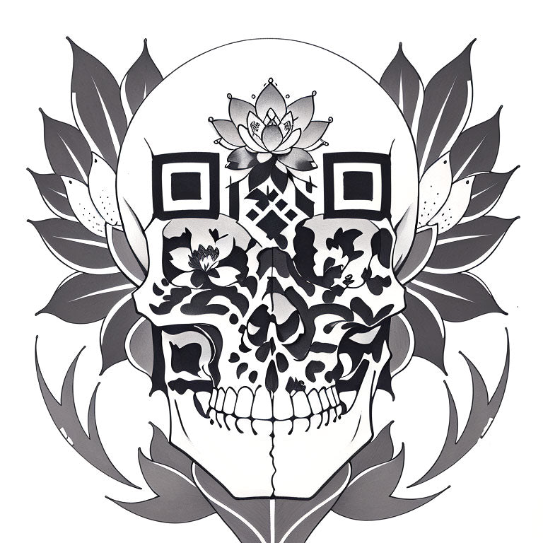 A skull with a blooming lotus in the center, surrounded by patterns of flowers, creates an unusual and non-standard tattoo composition. The skull, symbolizing mortality, is balanced by the blooming lotus, which represents enlightenment and spiritual growth. The crafted QR code is placed within the design, merging the concept of life and death with the modern digital world in a unique tattoo. This QR code enhances the tattoo’s meaning by adding a modern digital element.