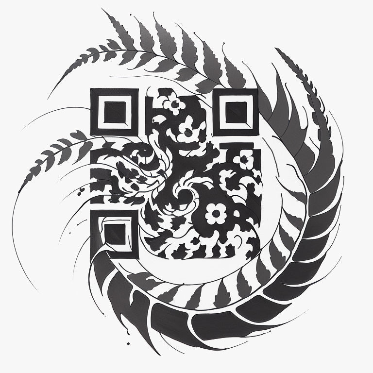 A delicate fern leaf twists into a mesmerizing spiral, reflecting the natural geometry often seen in sacred patterns and ancient symbolism. The spiral form embodies growth, renewal, and harmony, making it a meaningful design choice. The fine black ink lines highlight the organic details of the fern, emphasizing its graceful curves and intricate veins. Embedded within the composition is an artful tattoo QR code, uniting the beauty of botanical art with digital connectivity in a minimalist yet sophisticated style, where the QR code enhances both the design’s aesthetics and its functionality.