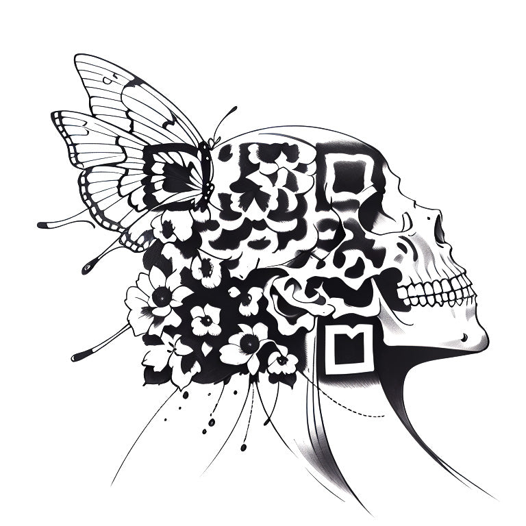 A skull with a hairstyle adorned with flowers and a butterfly resting on top creates a delicate and light tattoo design. The skull, symbolizing mortality, is softened by the beauty of the flowers and the whimsical butterfly, evoking themes of life and death in a balanced way. The unique tattoo QR code is cleverly incorporated into the design, merging the dark and light elements of the tattoo with modern digital technology. This QR code adds a unique twist, blending nature's beauty with the digital age for a one-of-a-kind artistic expression.