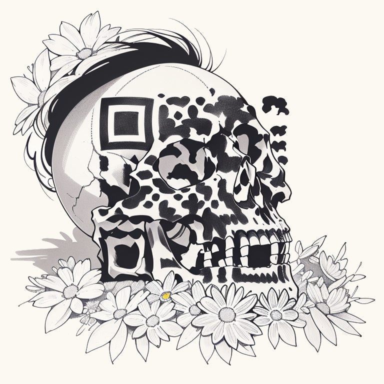 A skull rests solemnly on a bed of daisies, creating a striking contrast between life and death. The delicate flowers, symbolizing purity and beauty, juxtapose the skull, which represents mortality and strength. This unique tattoo QR code design is artfully drawn, with intricate details that capture the essence of both life and death. The QR code placed in the center adds a contemporary, digital touch to this classic imagery, making it a timeless piece with a modern twist.