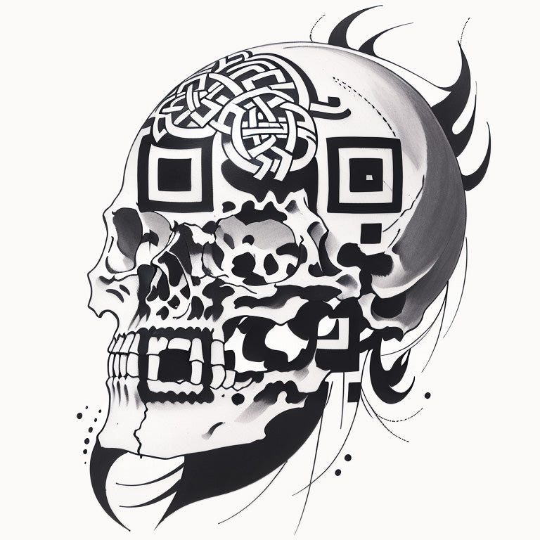 A skull surrounded by intricate Celtic patterns merges ancient symbols with modern design. This artistic QR code tattoo features detailed lines and spirals that reflect the strength and mystery of Celtic heritage. The patterns add a layer of depth, making the skull a symbolic representation of time and culture, with the QR code embedded within the design, seamlessly combining the past and present in a visually compelling way.