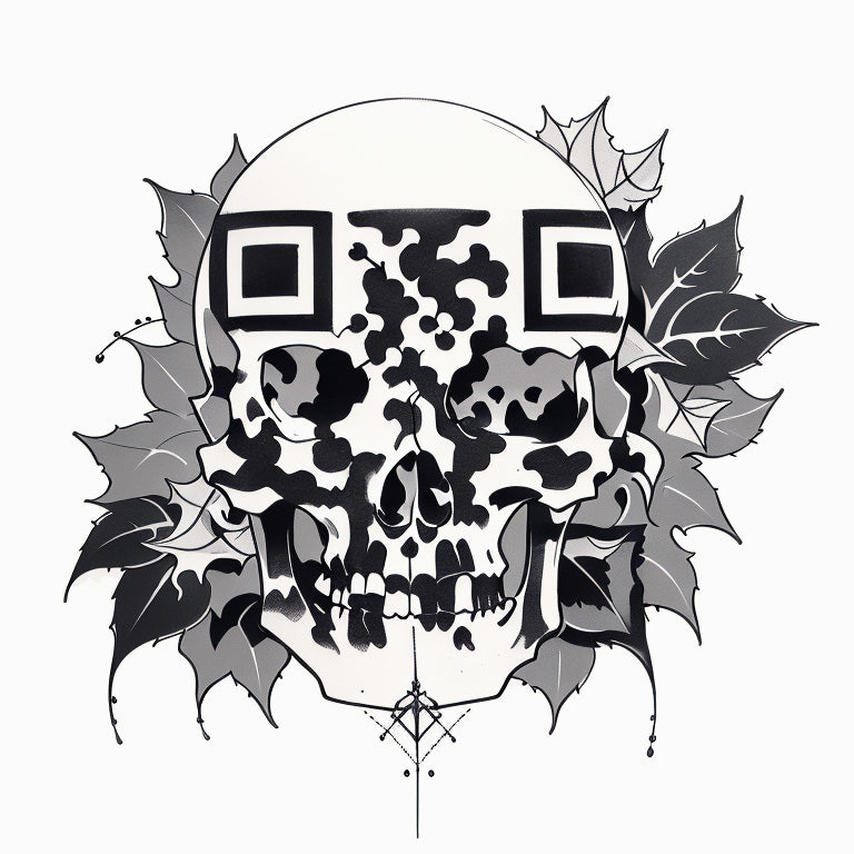 A skull adorned with rose leaves and plant elements creates a striking contrast between life and death in this unique tattoo QR code. The intricate design combines natural beauty with the starkness of the skull, while the QR code is seamlessly integrated into the artwork. This tattoo embodies strength, resilience, and the beauty of nature.