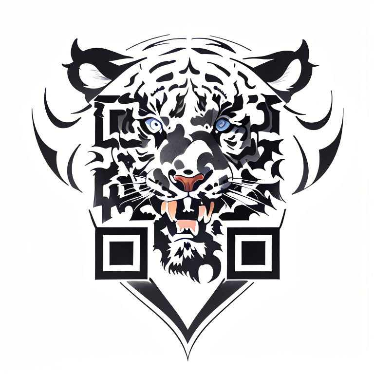 A fierce tiger head stares boldly forward, exuding strength, determination, and grace. The dynamic lines and detailed rendering of the tiger create an image of power and beauty, with its piercing gaze demanding attention. This unique tattoo QR code design combines timeless elegance with modern technology, integrating the QR code into the fierce beauty of the tiger. The QR code adds a digital dimension to this powerful tattoo art, merging strength with functionality.