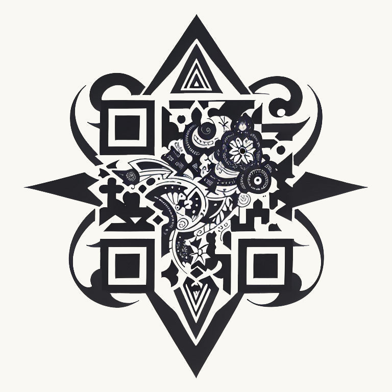 A star-shaped design filled with intricate tribal patterns, creating a bold, geometric tattoo that symbolizes strength and identity. This unique QR code tattoo integrates the sharp edges of the star with cultural motifs, blending tradition and innovation. The design captures the energy of the tribe, with the QR code hidden seamlessly within its tribal form, adding a modern twist to this ancient symbol.