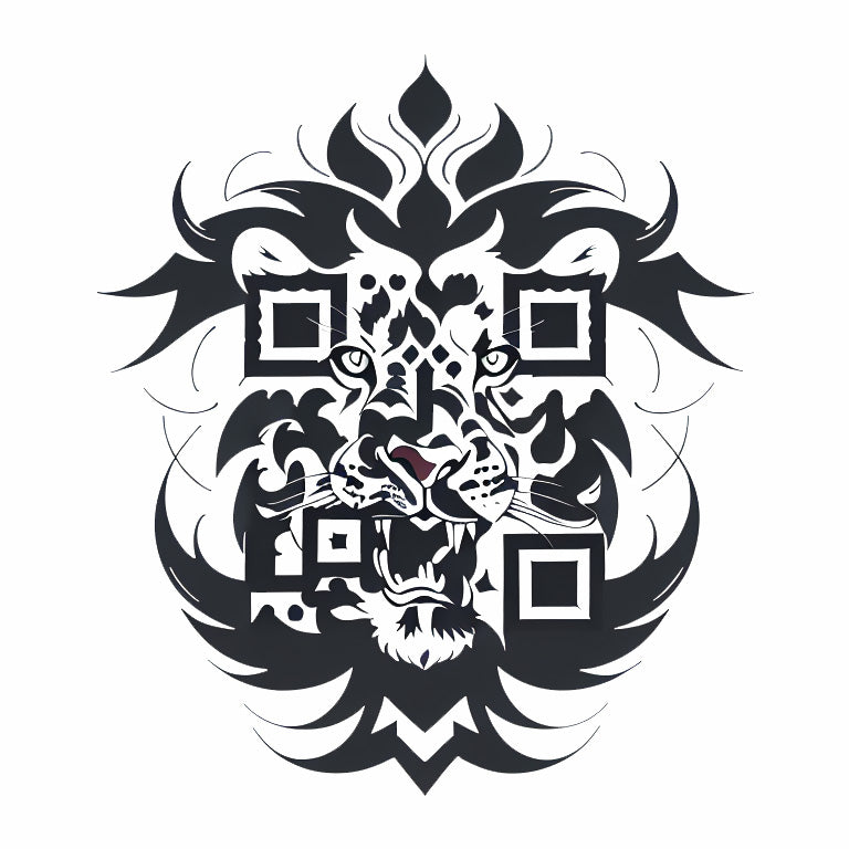 A lion’s head, with a magnificent and flowing mane, is rendered in a vector graphic style that emphasizes the power and nobility of the animal. The clean lines and bold shapes create a striking image that exudes strength and courage. The unique tattoo QR code is embedded within the design, adding a contemporary element to the timeless symbolism of the lion. This tattoo is a powerful fusion of traditional symbolism and modern technology, where the QR code enhances the strength and innovation, merging the old and new.