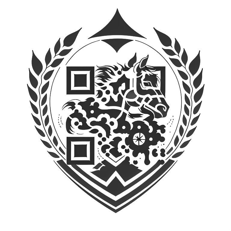 A coat of arms featuring a noble horse, flanked by laurel branches at the edges. This unique QR code tattoo symbolizes honor, nobility, and victory, with the horse representing strength and determination. The QR code is intricately woven into the design, blending seamlessly with the heraldic elements while maintaining its modern functionality.