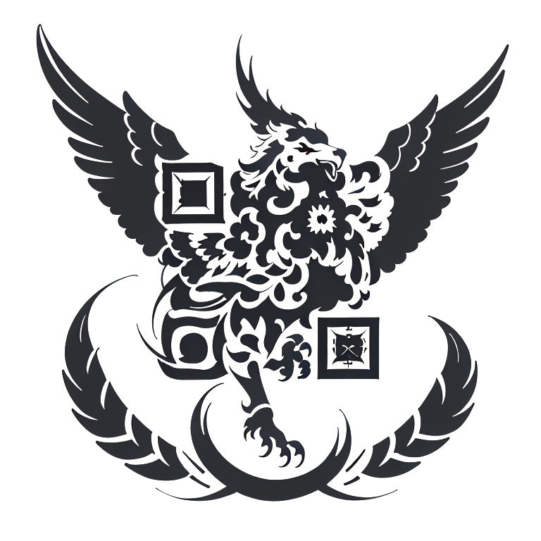 A coat of arms with a griffin soaring in the air with open wings creates a bold and striking tattoo design. The griffin, a symbol of strength and protection, is depicted in intricate black and white details that bring out its majestic and mythical nature. The unique tattoo QR code is seamlessly integrated into the design, blending ancient symbolism with modern technology. The QR code adds a contemporary, digital element to this powerful and artistic tattoo.