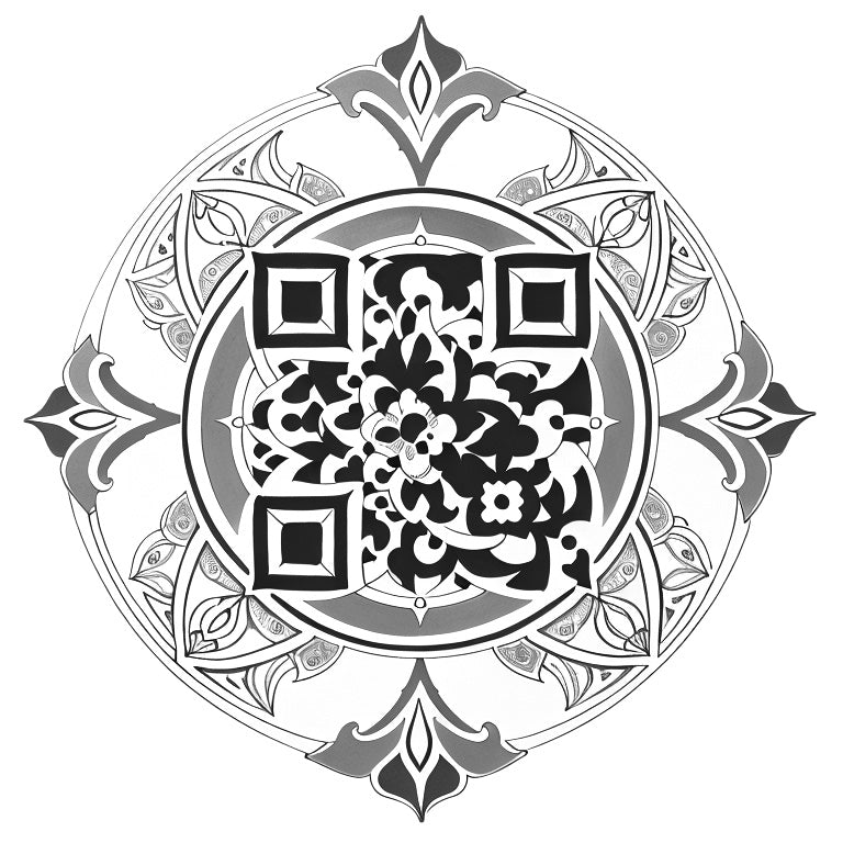 An intricate mandala with classic patterns forms a beautiful design that symbolizes harmony, eternity, and enlightenment. The detailed patterns within the mandala invite deep reflection and inner peace, with each element carefully balanced. The unique QR code is subtly placed within the mandala, seamlessly blending the ancient tradition with contemporary art. The QR code enhances the timeless beauty of the mandala with a modern digital touch.