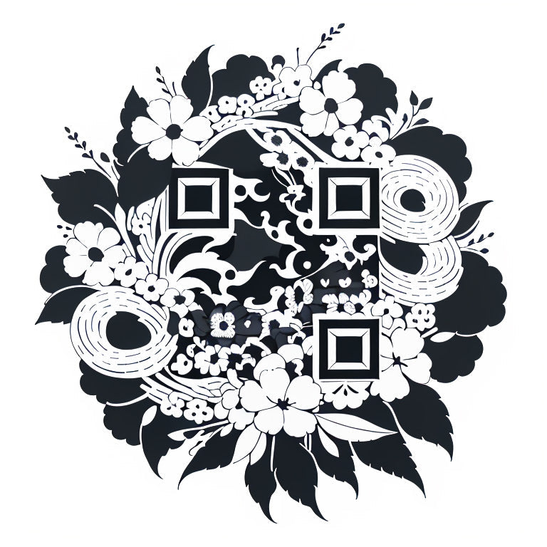 A wreath of wildflowers is drawn in black and white, capturing the delicate beauty and simplicity of nature. The intricate details of the flowers and leaves are thoughtfully arranged to create a sense of balance and harmony. The unique tattoo QR code is placed within the wreath, adding a modern twist to the timeless elegance of the design. This tattoo celebrates the beauty of nature while incorporating the functionality of the QR code, blending classic aesthetics with contemporary technology.