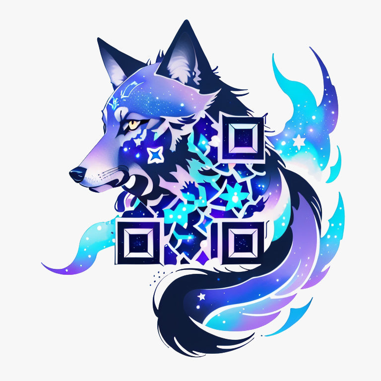 A galaxy-inspired wolf, in deep blues and purples with shimmering colors, represents the untamed spirit and mystery of the universe. The wolf, a symbol of strength, independence, and intuition, is set against a cosmic backdrop, creating a sense of wonder and awe. The unique QR code tattoo integrates the QR code into the swirling galaxy, merging the cosmic with the digital in an artistic and powerful tattoo.