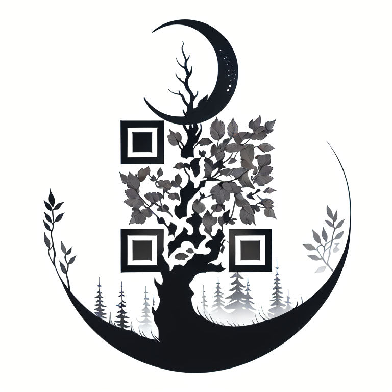 A lone tree stands against a forest backdrop, with a moon hanging above, casting a soft glow over the landscape. This unique QR code tattoo symbolizes the connection between nature and the cosmos, with the tree representing life and the moon evoking transformation. The QR code is incorporated into the design, adding an innovative element to this serene, cosmic scene.