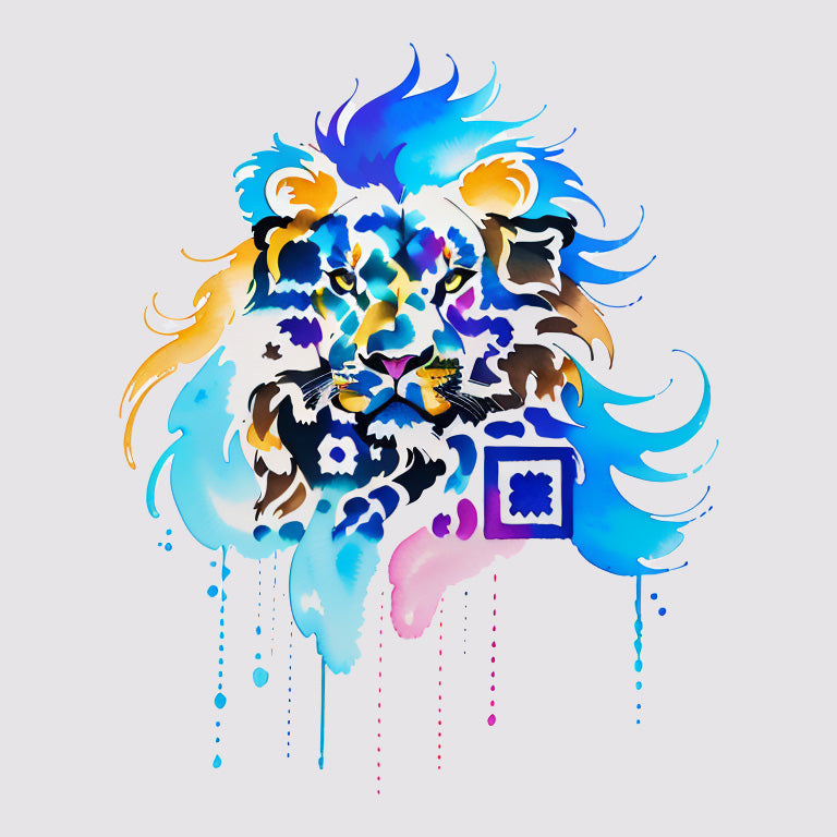 A rainbow watercolor splash forming the silhouette of a lion, vibrant and dynamic. This unique tattoo QR code tattoo showcases strength and power, with the lion representing courage and leadership. The splash of colors brings the lion’s majestic form to life, while the QR code blends naturally into the watercolor, offering a fresh, modern take on a classic symbol.