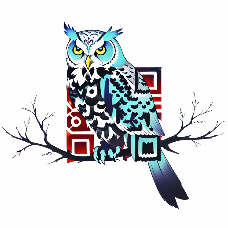 A colorful owl with bright glowing eyes sits perched on a branch, its feathers radiating with vibrant hues. The owl, a symbol of wisdom and mystery, is captured in stunning detail with a digital painting style that enhances its mesmerizing gaze. The unique tattoo QR code is seamlessly integrated into the composition, making this tattoo not only a work of art but also a functional piece of technology. The QR code adds a modern twist to the ancient symbolism of the owl, merging the mystical with the digital in a captivating design.