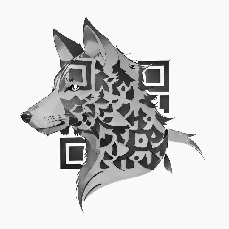 A wolf head, outlined in clean, sharp lines, gazes off into the distance with a piercing, intense look. This unique QR code tattoo symbolizes freedom, intuition, and the untamed spirit of the wolf. The sharp lines and fierce expression evoke the wolf’s primal strength, while the QR code is subtly incorporated into the design, adding a contemporary element to this bold image.