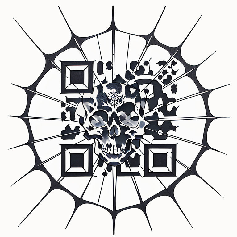 This striking black-and-white QR code tattoo presents an intricate spider web with a subtle yet haunting skull at its center. The fine digital ink work enhances the eerie yet elegant composition, offering a gothic aesthetic with a hidden edge. A perfect blend of mystery and sophistication, this QR code tattoo is ideal for those who appreciate symbolic art with a dark twist.