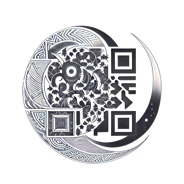 An abstract composition featuring a crescent moon and geometric patterns creates a captivating design full of balance and mystery. The flowing lines and shapes evoke a sense of serenity and otherworldliness. The unique QR code is seamlessly incorporated into the design, adding a modern digital element to this cosmic, artistic tattoo. This crafted QR code tattoo is a perfect representation of the intersection between the abstract and the digital.