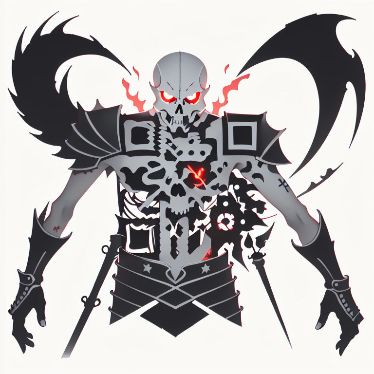 A skeleton knight stands vigilantly, its glowing red eyes piercing through the darkness as it guards an unknown realm. This haunting figure, representing the warrior’s indomitable spirit, exudes a sense of stoic determination. Intricate detailing in the knight’s armor and skeletal form adds depth and intensity to the tattoo. The unique QR code embedded within the composition highlights the fusion of past and present, merging classic symbolism with digital functionality, ensuring the design is both visually captivating and interactive.