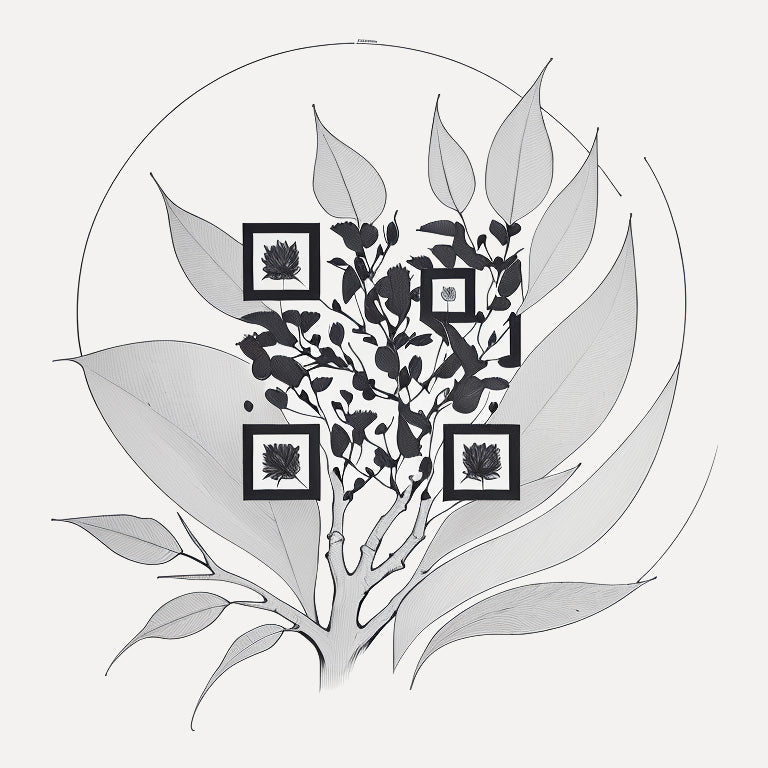 A floral composition featuring soft, rounded leaves surrounding a central art element, creating a harmonious and peaceful design. This unique tattoo QR code symbolizes growth and balance, with each leaf representing a different aspect of nature's beauty. The QR code is seamlessly integrated into the design, making it both a striking piece of art and a modern piece of technology.