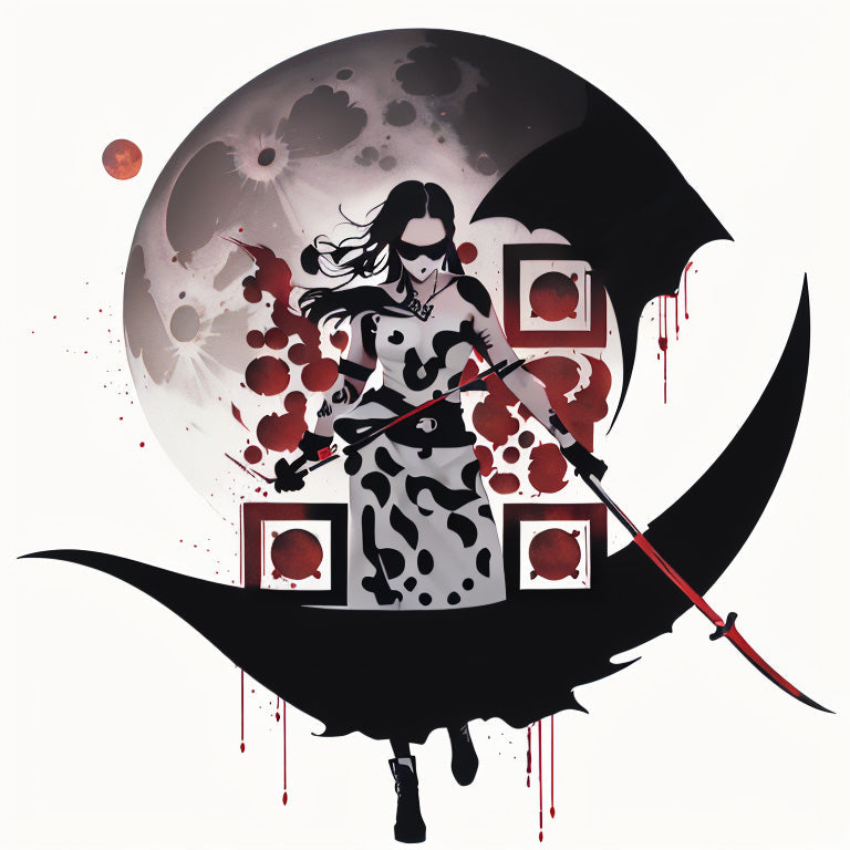 A warrior stands strong, swords drawn, against the backdrop of a red moon that bathes the scene in an ominous glow. The red moon adds a sense of foreboding and power, while the warrior symbolizes strength and courage in the face of adversity. This unique tattoo QR code design blends classic tattoo art with a modern twist, integrating the QR code into the composition for added functionality. The QR code allows this powerful image to also serve as a modern tool, merging the ancient art of tattooing with the convenience of digital technology.