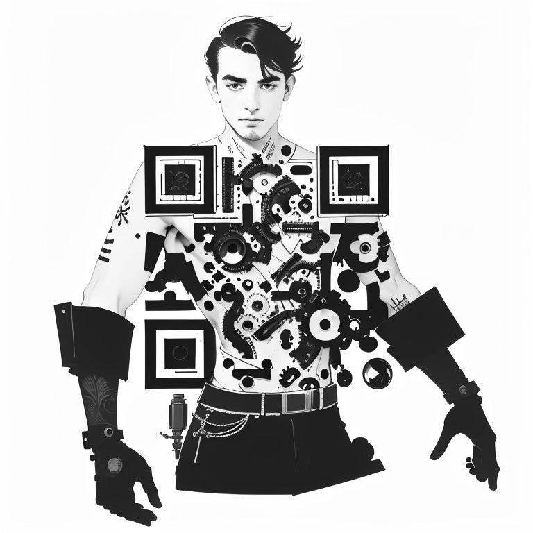 A Victorian gentleman adorned with mechanical parts and gears, combining the elegance of the past with the innovation of the future. This unique QR code tattoo highlights the fusion of vintage style with steampunk aesthetics, with the gentleman’s attire enhanced by intricate mechanical details. The QR code is seamlessly integrated into the gears and mechanisms, blending seamlessly with the overall design.