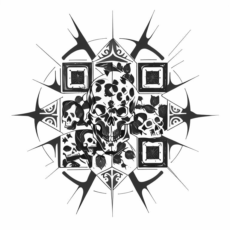 A skull inscribed in a circle of patterns, enhanced by geometric elements, forms the center of this unique tattoo QR code. The geometric design adds structure and balance to the chaotic nature of the skull, creating a harmonious blend of hard and soft lines. The QR code is seamlessly integrated into the tattoo, offering a modern twist on the classic skull motif.