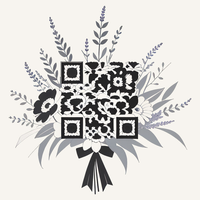 A bouquet of zinnias, lavender, and eucalyptus, beautifully tied with a bow, creates a floral arrangement that exudes elegance and freshness. Zinnias symbolize endurance and strength, lavender represents calmness and peace, and eucalyptus brings a sense of healing and wellness. The crafted QR code is delicately placed within the design, merging the timeless beauty of flowers with the modernity of a digital code. This QR code adds a contemporary touch to this vibrant fusion of nature and technology.