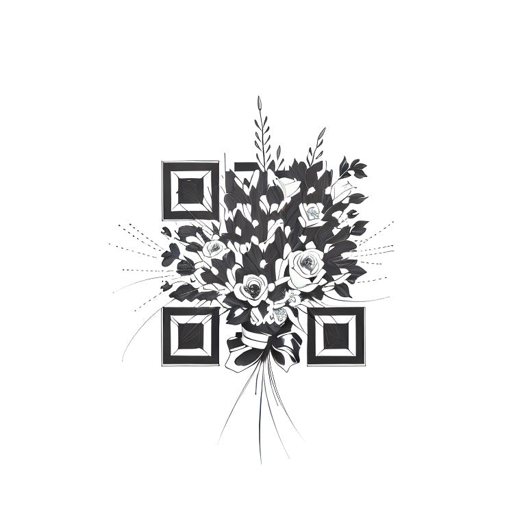 A beautiful floral composition, featuring a bouquet of roses and lilies tied together with a delicate bow. This artistic QR code tattoo symbolizes love, beauty, and purity, with the roses representing passion and the lilies symbolizing devotion. The QR code is cleverly incorporated into the design, adding a modern twist to the classic floral elements.