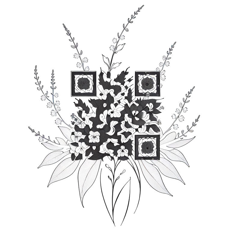 An illustration with flowers and herbs creates a natural and serene tattoo composition. The flowers, each with its own symbolism of beauty, love, and healing, are paired with delicate herbs that bring a sense of peace and connection to nature. The unique QR code is subtly integrated into the design, adding a modern touch to this timeless botanical art. This QR code enhances the serenity of the tattoo by blending nature with technology.