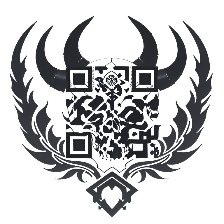 A Viking-style skull with horns and runic engravings brings together elements of strength and ancient symbolism. The skull, adorned with intricate engravings, represents power, wisdom, and the spirit of the Viking warriors. The artistic QR code tattoo is embedded into the design, merging Norse mythology with modern digital elements in a striking composition. This QR code adds an unexpected digital depth to the ancient narrative.