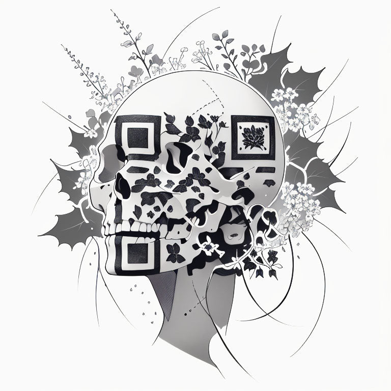 A skull entwined with ivy and wildflowers growing through its holes forms this art tattoo QR code. The intricate details of the ivy and flowers contrast beautifully with the starkness of the skull, creating a balance between life and death. The QR code is integrated into the design, making it both a work of art and a functional piece. This tattoo embodies both beauty and strength, making it a timeless choice.