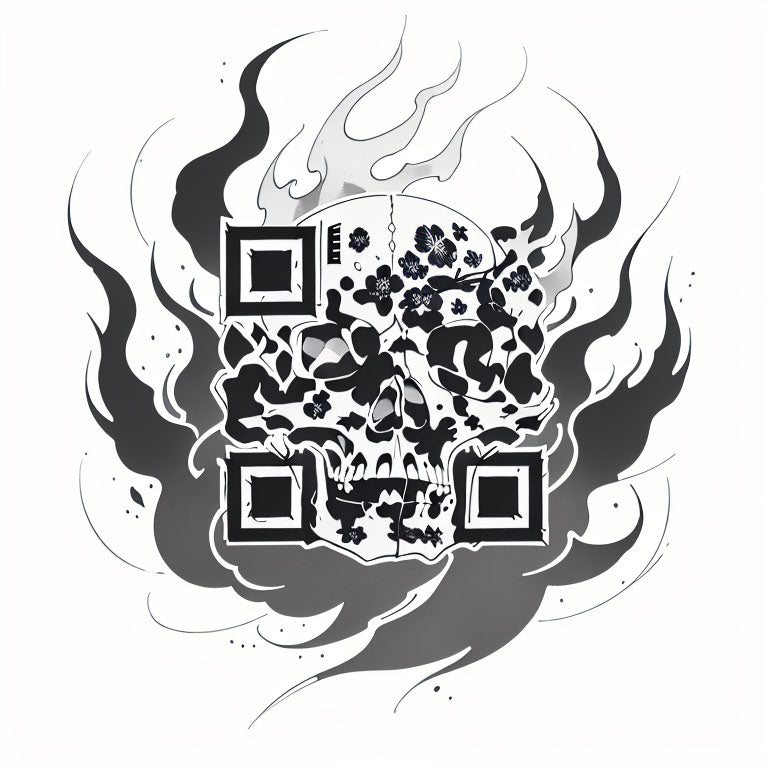 A skull surrounded by flames and smoke forms an intricate design that speaks to the raw power and intensity of life and death. The swirling smoke and fiery flames represent destruction, rebirth, and transformation. The unique tattoo QR code is embedded within the fiery design, merging the symbols of life’s chaos with the precision of digital art. This QR code adds a modern element to the raw energy of the tattoo, combining the chaotic forces of life and death with digital innovation.