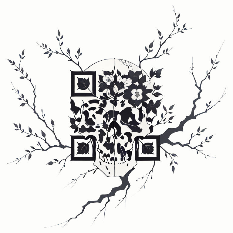 From the cracks of an aged skull, branches and leaves emerge, symbolizing renewal, transformation, and the cycle of life. The fine black ink details emphasize the organic shapes growing from the skeletal form, creating a hauntingly beautiful contrast between decay and rebirth. At the heart of the composition, a crafted QR code seamlessly integrates into the artwork, adding a layer of hidden meaning. This QR code enhances the thematic richness of the design.